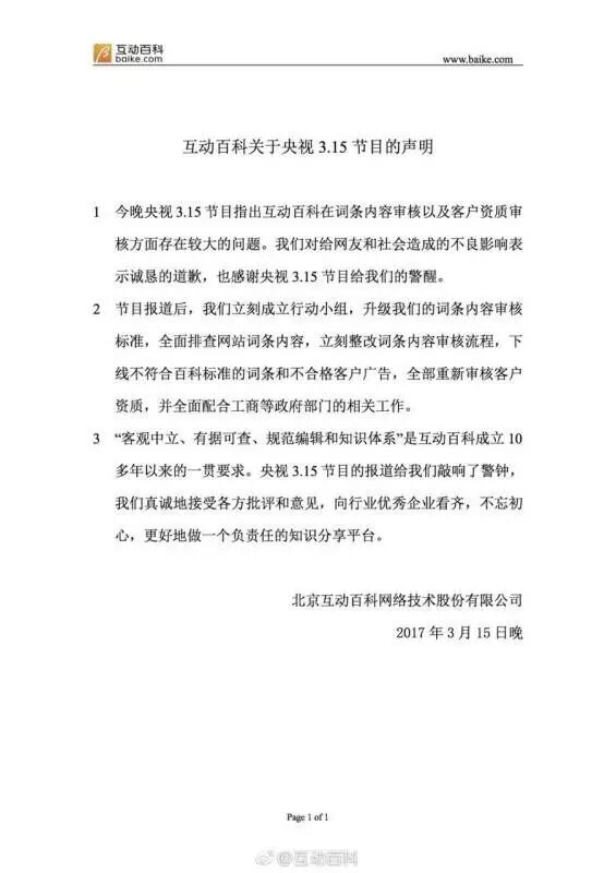 晚會曝光后,互動百科立即發布聲明,承認錯誤并整改。