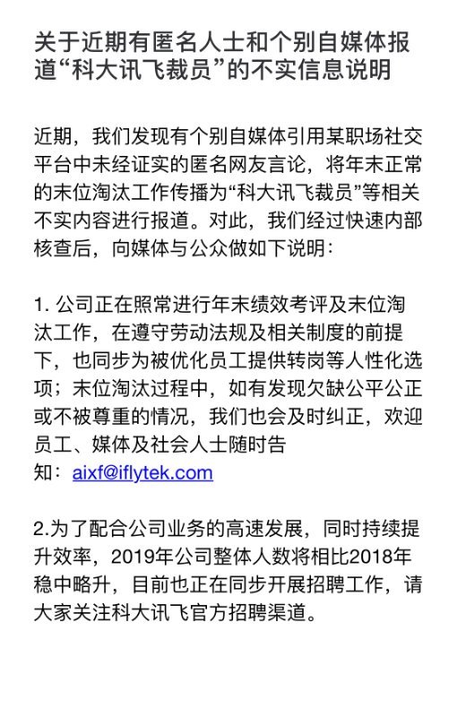 對此消息,科大訊飛回應(yīng)稱,相關(guān)傳言系不實(shí)信息,公司正在進(jìn)行年末業(yè)績考評及末位淘汰工作,也同步為被優(yōu)化員工提供轉(zhuǎn)崗等人性化選項(xiàng)。科大訊飛還稱,2019年公司整體人數(shù)將比2018年穩(wěn)中略升,目前也正在同步開展招聘工作。