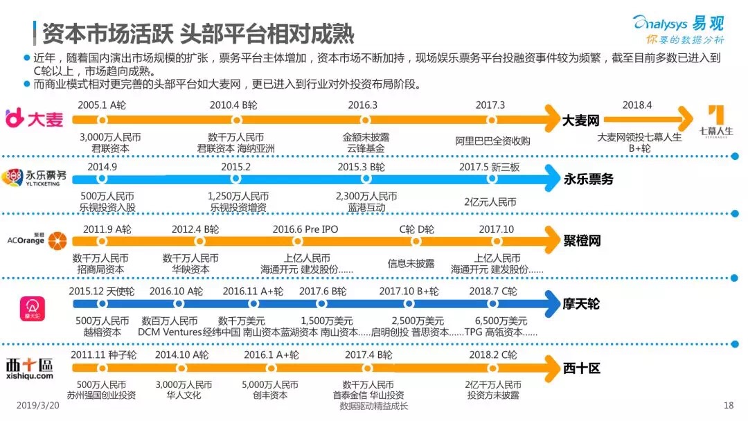 報告顯示,隨著現場娛樂行業多元化進程的推進,除大麥網等現場娛樂綜合服務商外,開心麻花、保利劇院等主辦方票務平臺,淘票票、貓眼電影票務平臺,淘寶等綜合電商/生活服務平臺,蝦米音樂等音樂流媒體平臺,以及B站等文娛資訊/社群平臺紛紛參與到票務市場的競爭中,形成百花齊放的格局。