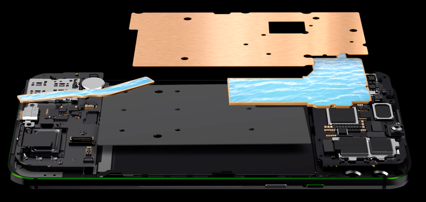 有了更為強勁的處理器,想要維持穩(wěn)定的游戲表現(xiàn),就需要更好的散熱系統(tǒng)來壓制運行時產(chǎn)生的熱量。為此,黑鯊游戲手機2將液冷系統(tǒng)升級到了3.0,官方稱之為“塔式全域液冷系統(tǒng)”。