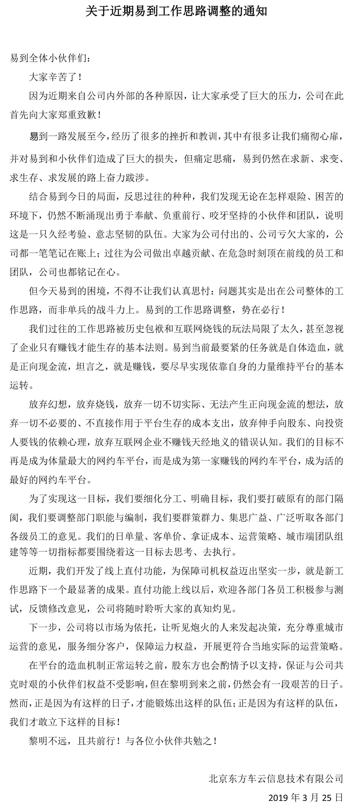 該《通知》中寫道,易到一路發展至今經歷了很多的挫折和教訓,對易到和小伙伴們造成了巨大的損失,但易到仍然在求新、求變、求生存、求發展的路上奮力跋涉。
