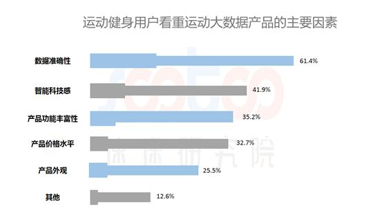 在運動健身用戶看重運動大數據主要方面的調研中,數據準確性是用戶最看重的因素。目前行業內數據并沒有標準化,測量的數據準確性還不夠,不同產品的測量結果往往大相徑庭,在數據源方面,國內大數據產品企業還有很大的進步空間,更可靠的數據源才能真正的打動用戶。有很大一部分用戶看重產品的科技感,科技感強烈的運動大數據產品用戶更愿意嘗試,反之會都覺得缺乏嘗試的吸引力。
