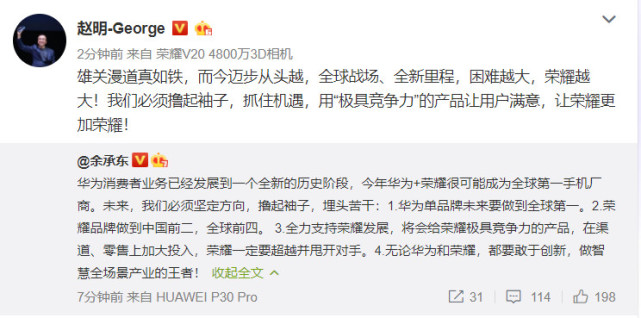 4月2日消息,華為消費者業務CEO余承東今日發布微博明確了華為和榮耀的目標:華為單品牌未來要做到全球第一,榮耀品牌做到中國前二,全球前四。