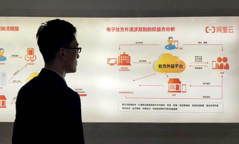 首屆世界大健康博覽會期間,一名觀眾觀看阿里云區(qū)塊鏈電子處方展示圖
