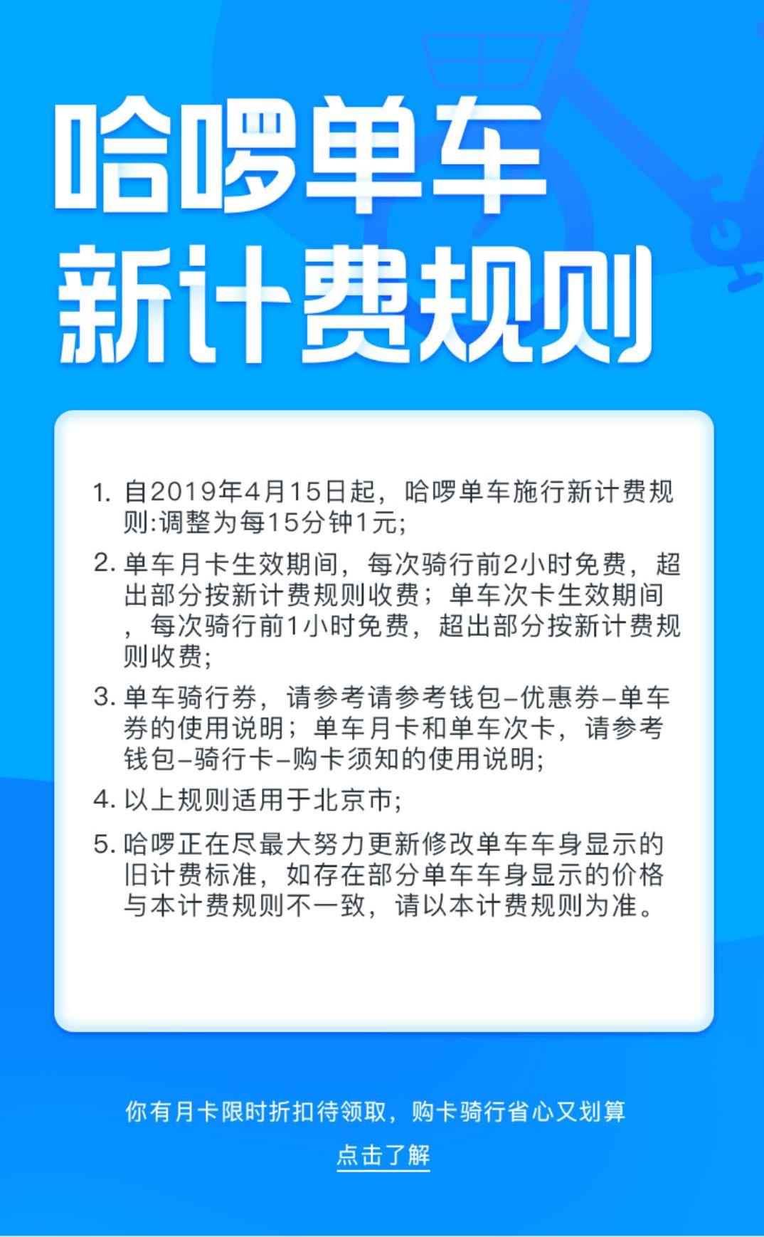 速途網4月8日消息(報道:李楠)今天,哈啰單車App內發布新計費規則,自2019年4月15日起,哈啰單車計費規則調整為每15分鐘1元。