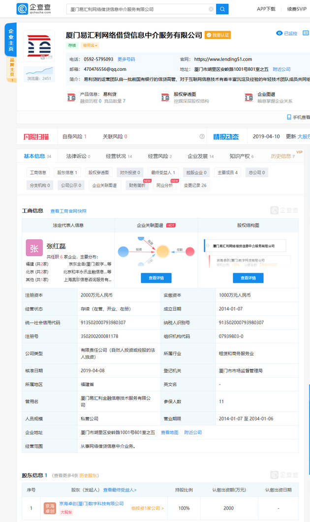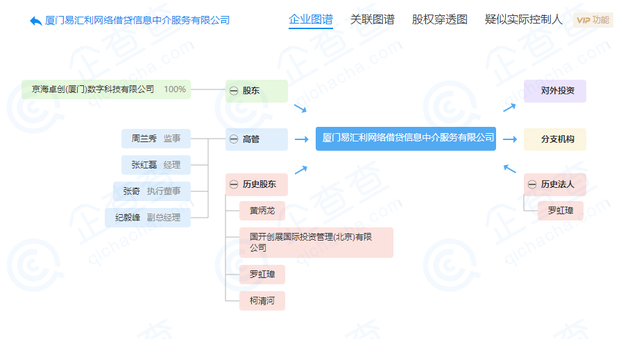 4月10日消息,企查查數據顯示,廈門易匯利網絡借貸信息中介服務有限公司近日發生多項工商變更,原股東全部退出,大股東由易利貸董事長黃炳龍變更為京海卓創(廈門)數字科技有限公司,持股比例100%,疑似實際控制人為劉強東,占股14.01%。