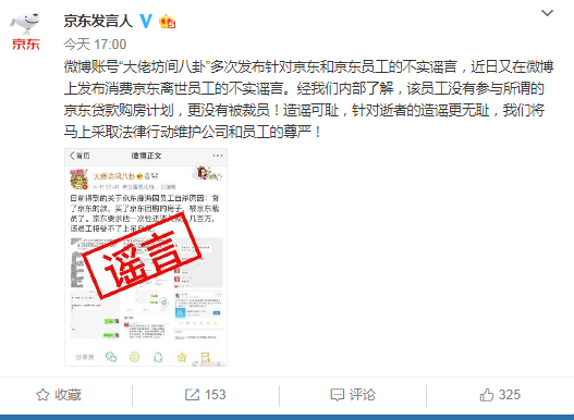 京東發言人同時稱,微博賬號“大佬坊間八卦”多次發布針對京東和京東員工的不實謠言,近日又在微博上發布消費京東離世員工的不實謠言,京東表示將馬上采取法律行動維護公司和員工的尊嚴。