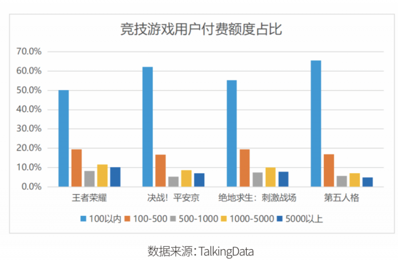報告顯示,購買皮膚等外觀加成、不對公平性產生影響的氪金方式成為國內玩家可以接受的主流收費模式。橫向比較《王者榮耀》、《決戰!平安京》、《絕地求生:刺激戰場》、《第五人格》四款以此種模式收費的游戲,《王者榮耀》的用戶付費意愿最強,有約一半的用戶在這款游戲?中花費了超過100元,其中付費在1000?5000元的超過10%, 超過5000元的約10%。