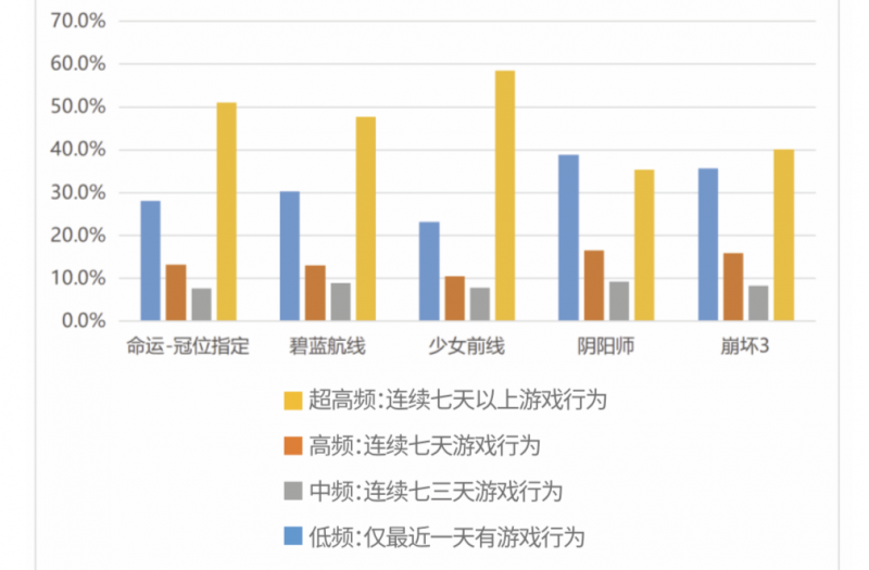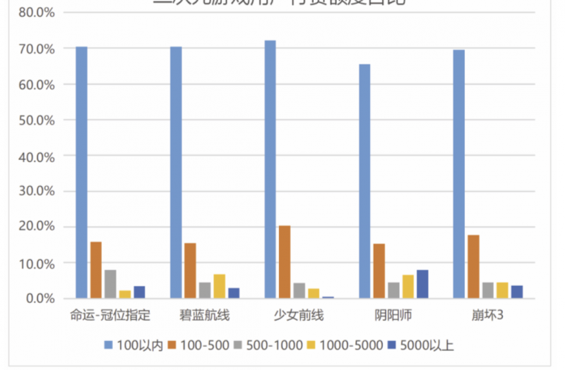值得欣喜的是,二次元游戲用戶付費意愿普遍較強,縱觀《命運/冠位指定》、《碧藍航線》、《少女前線》、《陰陽師》、《崩壞3》等五款游戲,愿意在游戲中投入100元以上的用戶占三成左右,其中,《陰陽師》用戶中付費1000?5000元的占6.6%、付費5000元以上的甚至占到8%,顯示出卓越的吸金能力;二次元游戲的粘性普遍較高,《命運/冠位指定》的用戶中有一半以上屬于“超高頻”玩家, 而《少女前線》的超高頻用戶甚至達到了?58.5%。
