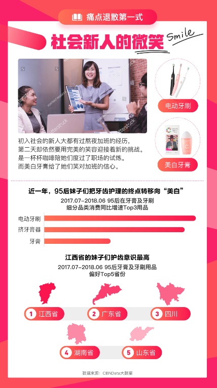 在職場受到青睞,一個甜美的微笑必不可少。最近一年,聚劃算電動牙刷、擠牙膏器的銷量暴漲。剛剛走出校園、走入職場的95后女性們把“美白”當作是牙齒護理的終極目標。