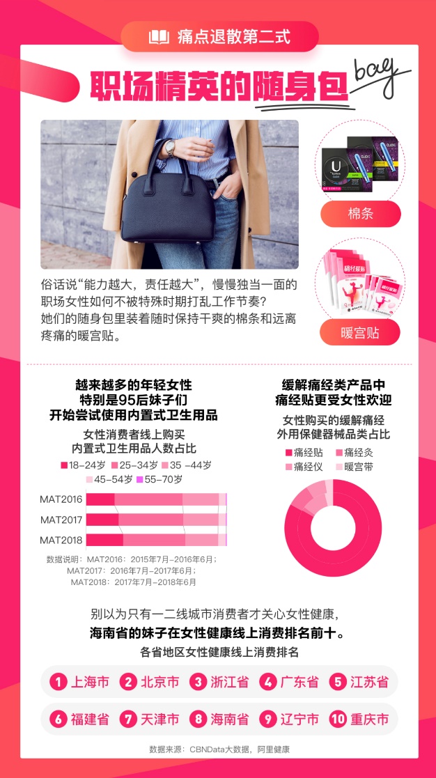 在生理期,越來越多的女性嘗試使用內置式衛生用品。使用者中,25-34歲的職場主力消費占比最高,18-24歲的年輕女性增幅最快。痛經貼、痛經灸、痛經儀和暖宮帶成為女性對抗生理期時最為青睞的“神器”。