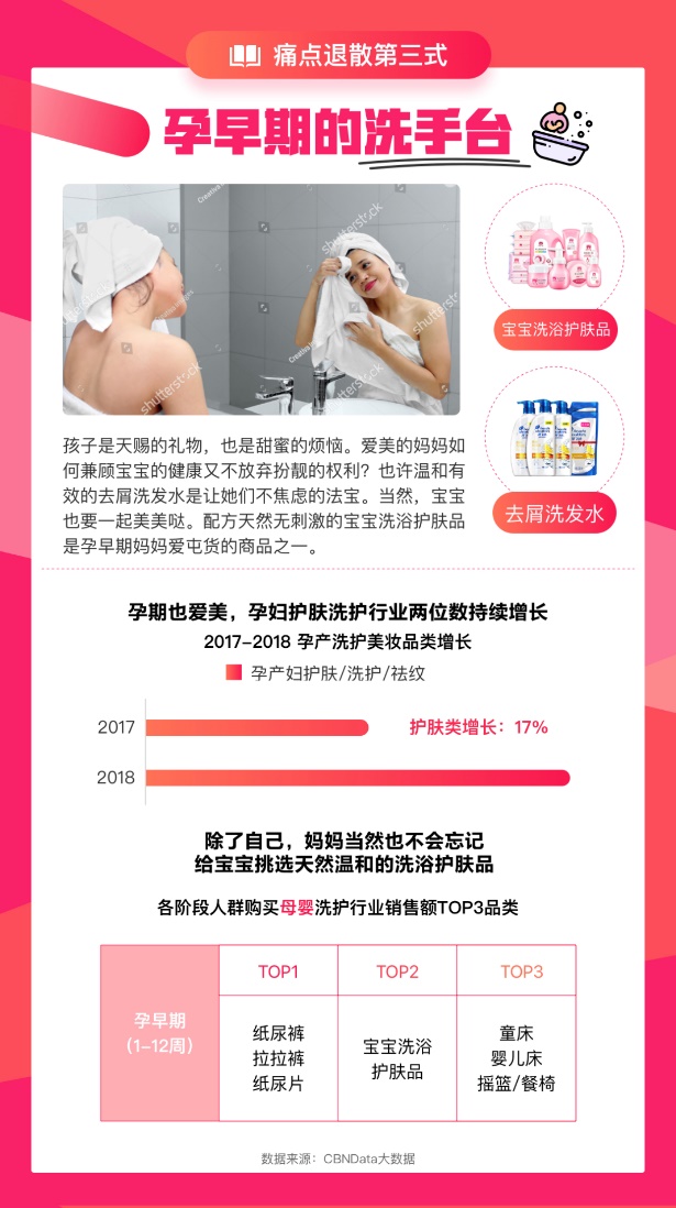 數據顯示,紙尿褲、寶寶洗浴護膚品和童床類產品是孕早期婦女(1-12周)最愛選購的商品。