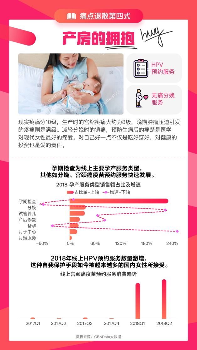 即將分娩的女性消費者,更青睞于孕期檢查、無痛分娩、產后修復、月嫂服務等產品。隨著中國女性健康觀念的提升,孕期檢查、無痛分娩等產品的消費增長明顯。HPV疫苗預約服務數量也激增,這種自我保護手段被越來越多的國內女性所接受。
