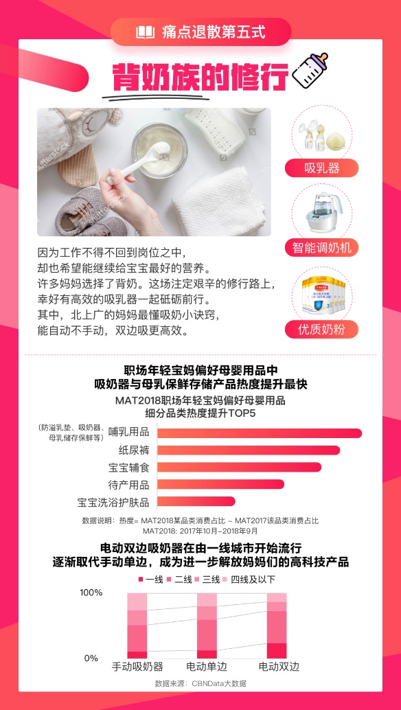 職業女性面對哺乳期疼痛時,更青睞防溢乳墊、吸奶器、母乳儲存保鮮等哺乳神器,其中吸奶器、智能調奶機銷售火爆。電動雙邊吸奶器在一線城市開始流行,逐漸取代手動單邊吸奶器,成為進一步解放職場媽媽們的高科技產品。