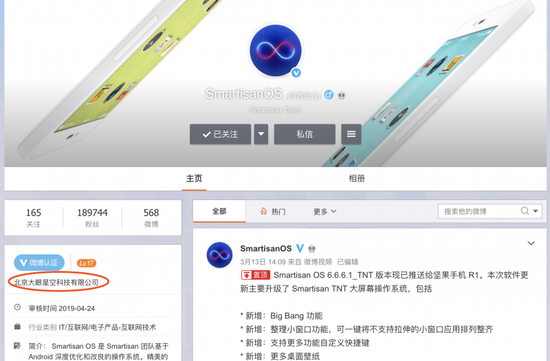 根據微博的認證信息,SmartisanOS微博審核時間為2019年4月24日,認證的主體為“北京大眼星空科技有限公司”,根據企查查的數據,該公司最開始名稱為“北京玩個不停科技有限公司”,成立于2018年3月23日,主要從事從事互聯網產品和手游開發等多個領域的移動互聯網公司。