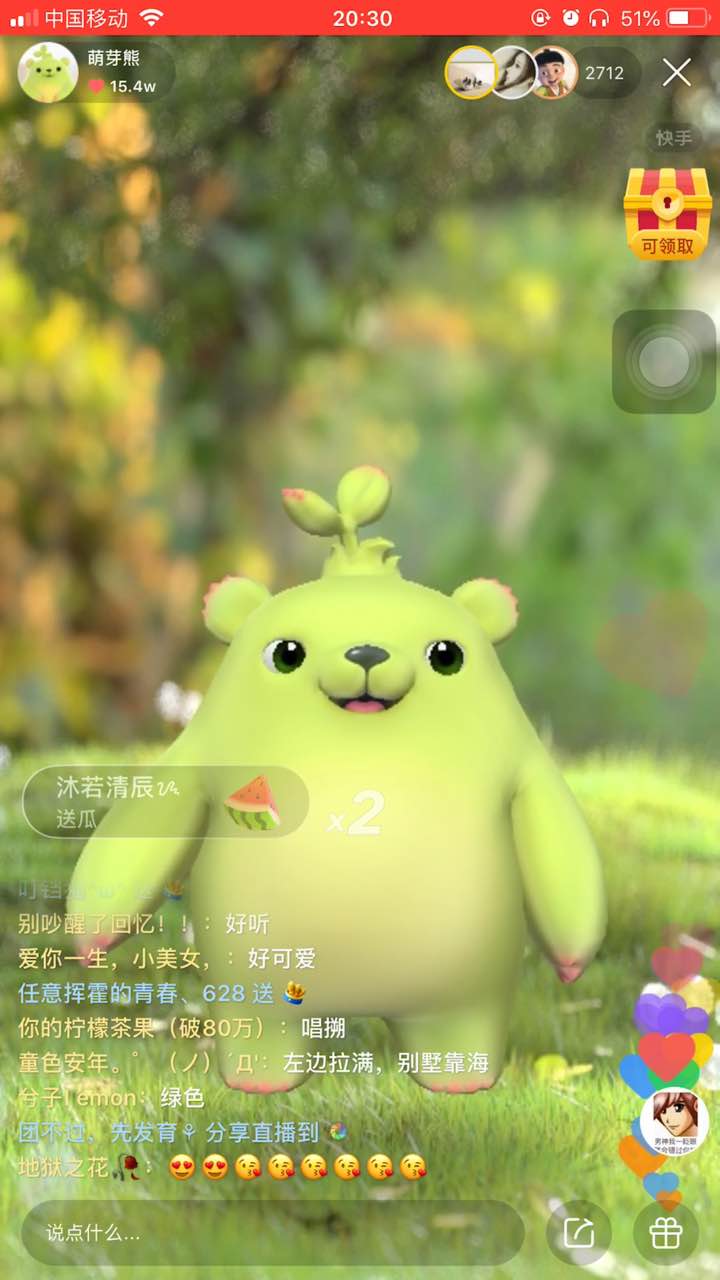 一禪小和尚之后,快手上非?;鸬牧硪粋€虛擬形象“萌芽熊”也進行了首次3D直播,擁有200多萬粉絲的萌芽熊1小時內收獲超過25萬個贊。