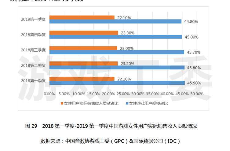 2019年第一季度,中國游戲女性用戶規模突破2.9億人,中國游戲市場女性用戶貢獻的實際銷售收入超129億,占據中國游戲市場總收入的22.1%。