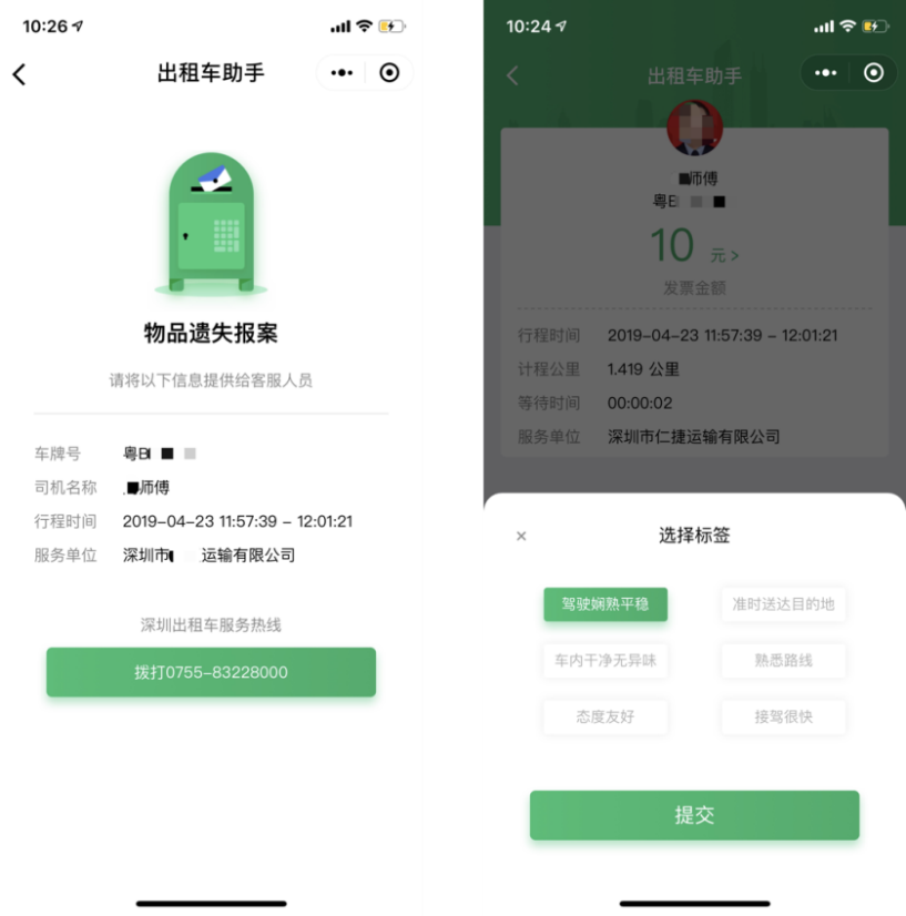 此外,乘客如果在乘車時遺失了個人物品,“出租車助手”小程序還能化身為尋找失物的好幫手。來深圳出差的黃女士就不慎將一份文件落在出租車上,通過“出租車助手”小程序關聯行程后,記錄乘車時間與車牌號,就順利地聯系上出租車司機,找回了失物。