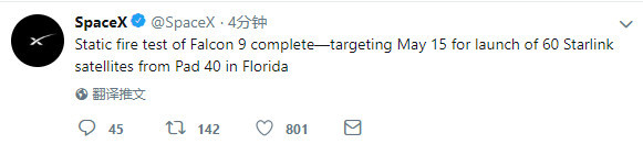 5月14日,SpaceX在推特上宣布其星鏈計劃靜態點火測試已經完成。根據計劃,5月15日,60顆SpaceX星鏈計劃衛星將于佛羅里達州佛州卡納維拉爾角40號發射位發射升空。
