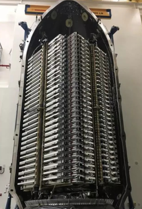 發射的方式很特別,是將60顆衛星裝在一個方形衛星分配器上,然后裝入獵鷹整流罩。每顆衛星超過200公斤,60顆總重量超過13噸,超過了SpaceX的發射記錄。