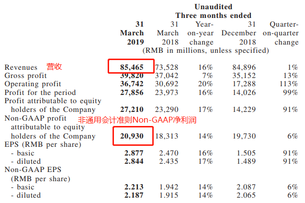 15日訊,騰訊今天下午發(fā)布2019年第一季度財報,財報顯示騰訊一季度營收854億元,同比增長16%;非通用會計準(zhǔn)則Non-GAAP下凈利潤209億元,同比增長14%;通用會計準(zhǔn)則下凈利272億元,同比增長17%。