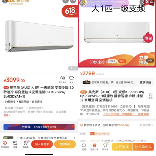 以市面熱銷的空調(diào)為例,同樣一款奧克斯1.5匹定頻掛機,京東售價1899元,蘇寧價為1799元;而一款奧克斯大1匹一級能效變頻空調(diào),京東標價3099元,蘇寧價卻打到了2799元,比京東整整低了300元……為什么同樣型號的奧克斯空調(diào),在蘇寧平臺的價格卻更低呢?
