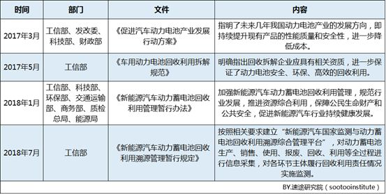 2018年7月,工信部印發(fā)《新能源汽車動力蓄電池回收利用溯源管理暫行辦法》,提到要建立“新能源汽車國家檢測與動力蓄電池回收利用溯源綜合管理平臺”,對動力蓄電池生產(chǎn)、銷售、使用、報廢、回收、利用等過程進(jìn)行信息采集 ,對各環(huán)節(jié)實施檢測。