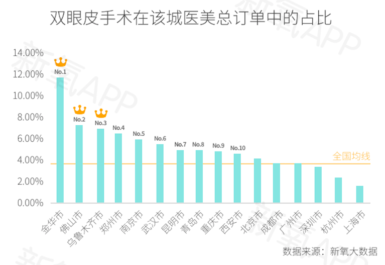在一個城市的醫美消費開始興起時,往往表現為總訂單量增長,同時雙眼皮手術項目占比較高。所以,中國脫單變雙意愿最強10城,同時亦為中國醫美消費新興10城,浙江金華、廣東佛山、新疆烏魯木齊市名列前3。