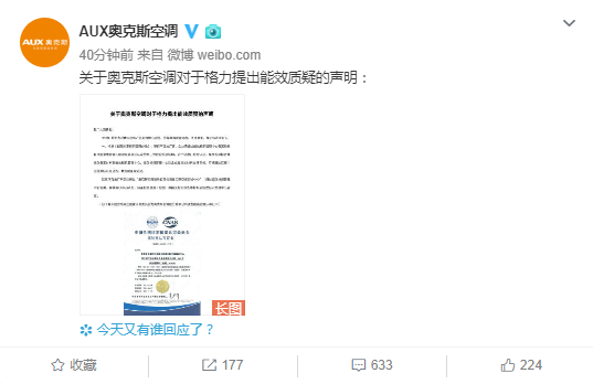 速途網(wǎng)6月12日消息(報(bào)道:吳佳馨)針對格力電器實(shí)名舉報(bào)奧克斯空調(diào)產(chǎn)品能效存在爭議一事,奧克斯空調(diào)股份有限公司官方微博于今日發(fā)表聲明稱,奧克斯所有產(chǎn)品出廠前均經(jīng)過具備檢測資質(zhì)的部門進(jìn)行檢測,并提交檢測報(bào)告等材料到能效標(biāo)識(shí)管理中心備案。