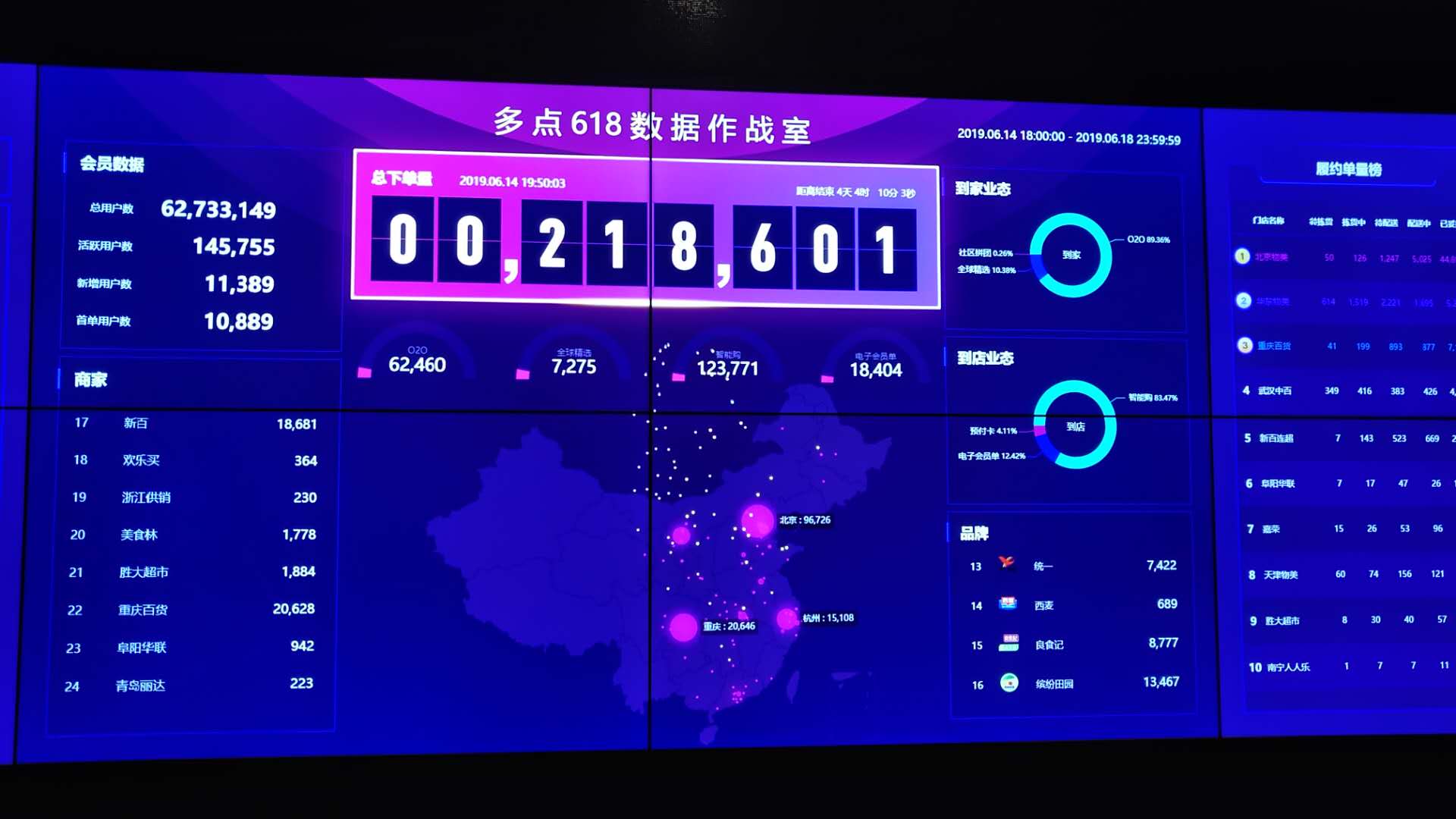 在多點Dmall618數據作戰室中,速途網看到多塊大屏幕實時顯示著各個維度的精準數據。這些數據包括:到家到店單量、合作商家銷量、品牌用戶畫像、線上流量轉化、配送履約情況等等。