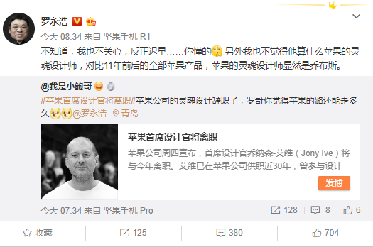 其中又以錘子科技的羅永浩為最。在艾維宣布離職后,羅永浩迅速發微博表示:“不知道,我也不關心,反正遲早……你懂的。另外我也不覺得他算什么蘋果的靈魂設計師,對比11年前后的全部蘋果產品,蘋果的靈魂設計師顯然是喬布斯。”