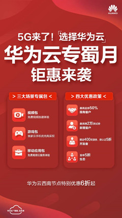 對于7月2日~8月31日期間的“華為云專蜀月”活動,華為云中國區CMO張鵬表示:此次“專蜀月”活動面向游戲、視頻、移動APP開發三大場景提供專屬產品禮包,并針對新老客戶、生態伙伴及開發者四類受眾分別定制了優惠政策。活動期間,華為云重點為四川以及西南地區的客戶上云降低門檻,特別推出了西南節點ECS S3云主機還提供6折特惠的活動。針對視頻、游戲、移動應用APP三大互聯網應用場景的特惠包,包括免費視頻加速體驗、全球獨家云手機優先購買權、免費高頻云服務體驗等權利。