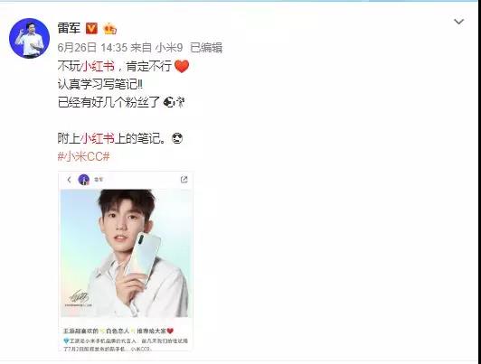 從B站上嘗到甜頭的小米,在布局小紅書之時,自然便將雷軍作為第一個吃螃蟹的人。于是,6月26日,雷軍在微博表示,“不玩小紅書,肯定不行”,并奉上自己的筆記。