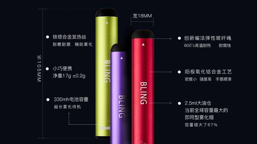 據(jù)介紹,全新Bling選擇了330毫安的電池+2.5ml煙油的配置,售價(jià)為49元/支,表現(xiàn)出了極高的性價(jià)比。