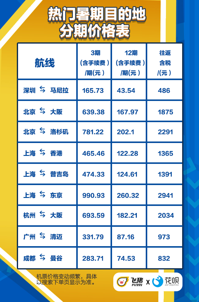 而采用飛豬花唄分期購票方式,3期付款每期只需約990元,12期分期更是低至每月只約260元,資金壓力陡降,旅行再也不用等。對于港澳、東南亞等票價較低地區,如深圳往返馬尼拉,總價480元分期后,每月只需要支付40余元,相當于一杯咖啡錢。