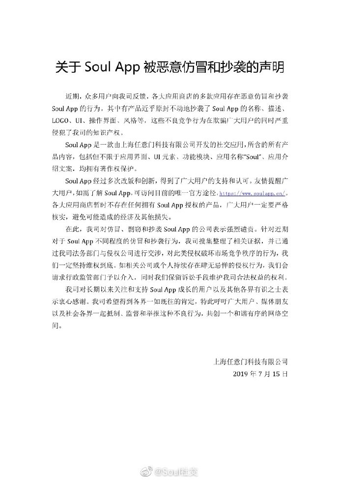 Soul表示,有產(chǎn)品近乎原封不動地抄襲了 Soul App 的名稱、描述、LOGO、UI、操作界面、風(fēng)格等,這些不良競爭行為在欺騙廣大用戶的同時嚴(yán)重侵犯了知識產(chǎn)權(quán),Soul會請求行政監(jiān)管部門予以介入,同時保留訴訟手段維護合法權(quán)益的權(quán)利。