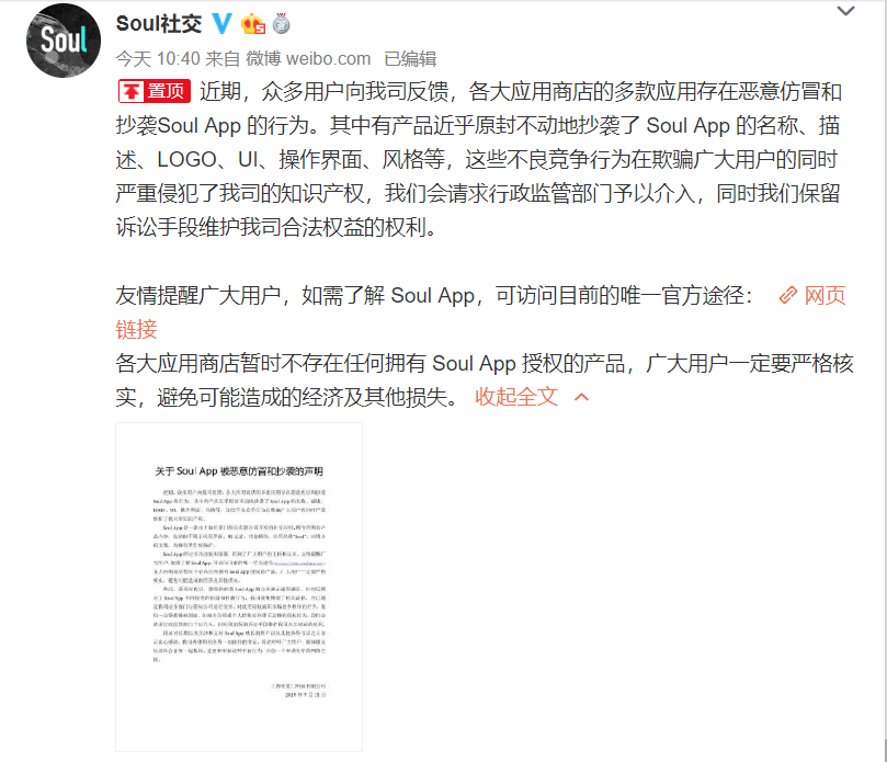 速途網(wǎng)7月15日消息(報道:李楠)今日,社交App“Soul”發(fā)布微博稱,各大應(yīng)用商店存在惡意仿冒和抄襲Soul App的行為。