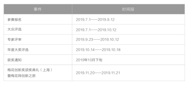 即日起至9月12日,為第七屆梅花創(chuàng)新獎公開征集參選作品階段,2018年9月2日-2019年9月1日期間的作品均可報名。有意參加評選的機構或個人可以通過梅花創(chuàng)新獎官網(wǎng)報名。