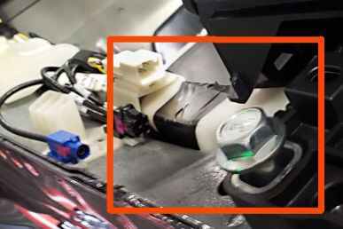 例如,這張照片顯示了膠帶被粘到了一個白色塑料外殼上,在這個位置,膠帶將“三攝像頭”設備連接固定在Model 3的內部。阿倫達斯說,這種塑料外殼的邊緣在安裝過程中經常會開裂,通常會用膠帶固定住由此產生的鉸鏈狀凸起。
