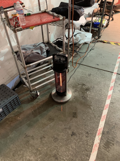 他分享了一些照片,照片上有一個漏水的屋頂和一個插著電的電暖器,附近有水坑。特斯拉表示,使用電暖器違反公司政策。