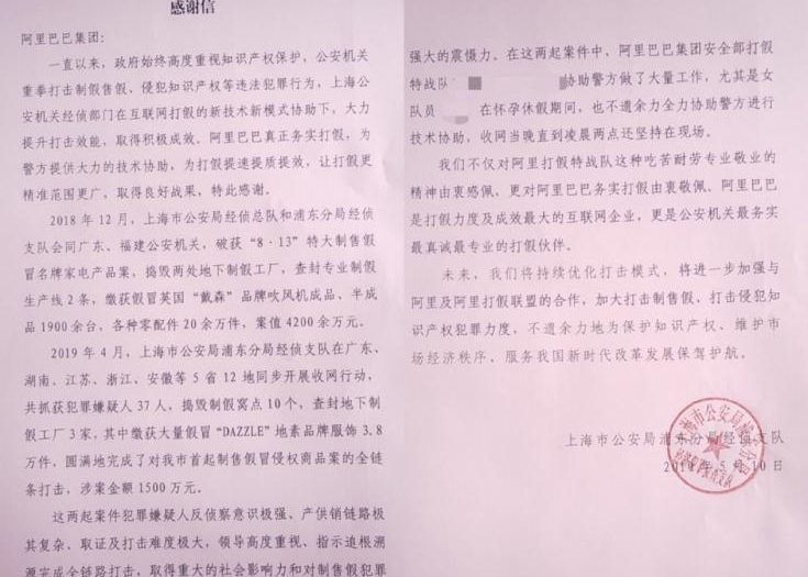 兩起案件偵破后,警方向阿里巴巴發出感謝信,稱阿里巴巴是打假力度及成效最大的互聯網企業,為警方提供大力的技術協助,為打假提速提質提效。