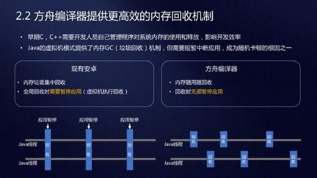 此外,方舟編譯器還帶來了新的系統垃圾回收機制。以往安卓的垃圾回收機制是集中回收,由于Java虛擬機的特點,系統會不斷地對內存進行標記。永不停歇地自動回收內存垃圾,保證內存不會溢出。方舟編譯器的回收方式則不同,它的內存回收機制是隨用隨回收,回收時不需要暫停應用而回收內存垃圾,這大大提高了系統運行速度。