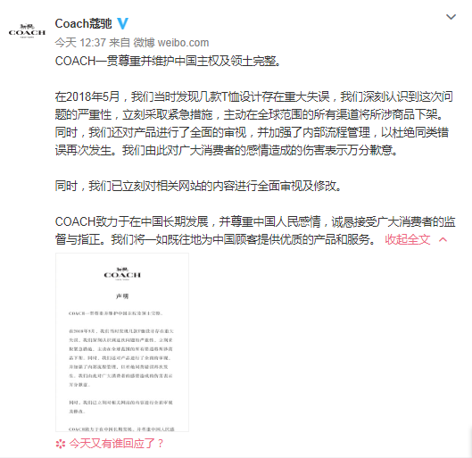 速途網8月12日消息(報道:吳佳馨)針對T恤設計存在重大失誤一事,Coach在其官方微博道歉,稱COACH一貫尊重并維護中國主權及領土完整。