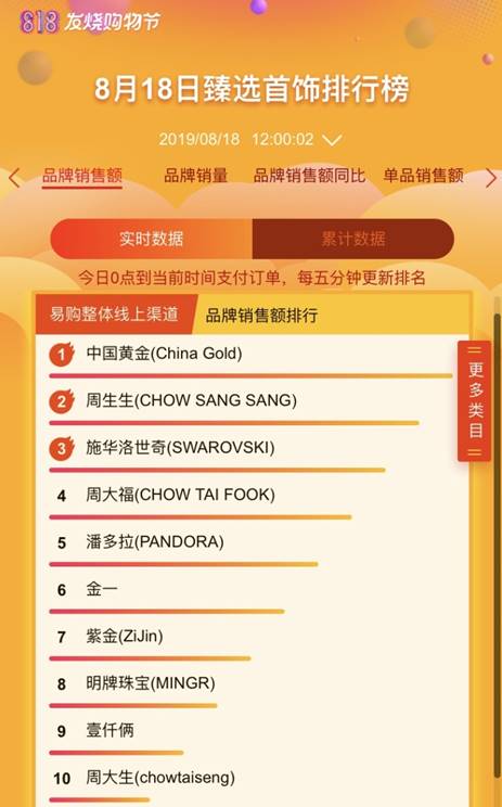 黃金珠寶成為蘇寧線上發力的又一優勢,中國黃金、周生生、施華洛世奇成為818甄選首飾品牌銷售額排行榜前三。