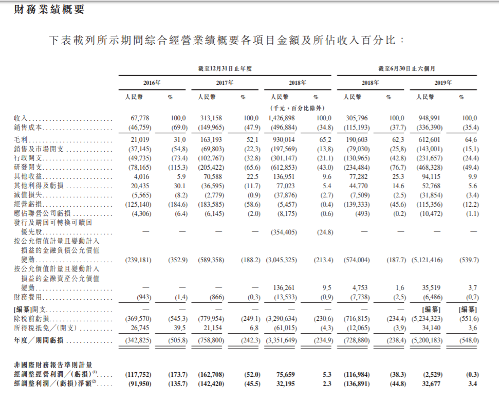 據招股書顯示,營收方面,曠視2016年、2017年、2018年分別為6780萬元、3.132億元、14.269億元,年復合增長率為358.8%。2019年上半年,曠視營收為9.49億元,同比增長210.3%,經調整凈利潤為3270萬元,2018年同期經調整凈虧損為1.369億元。