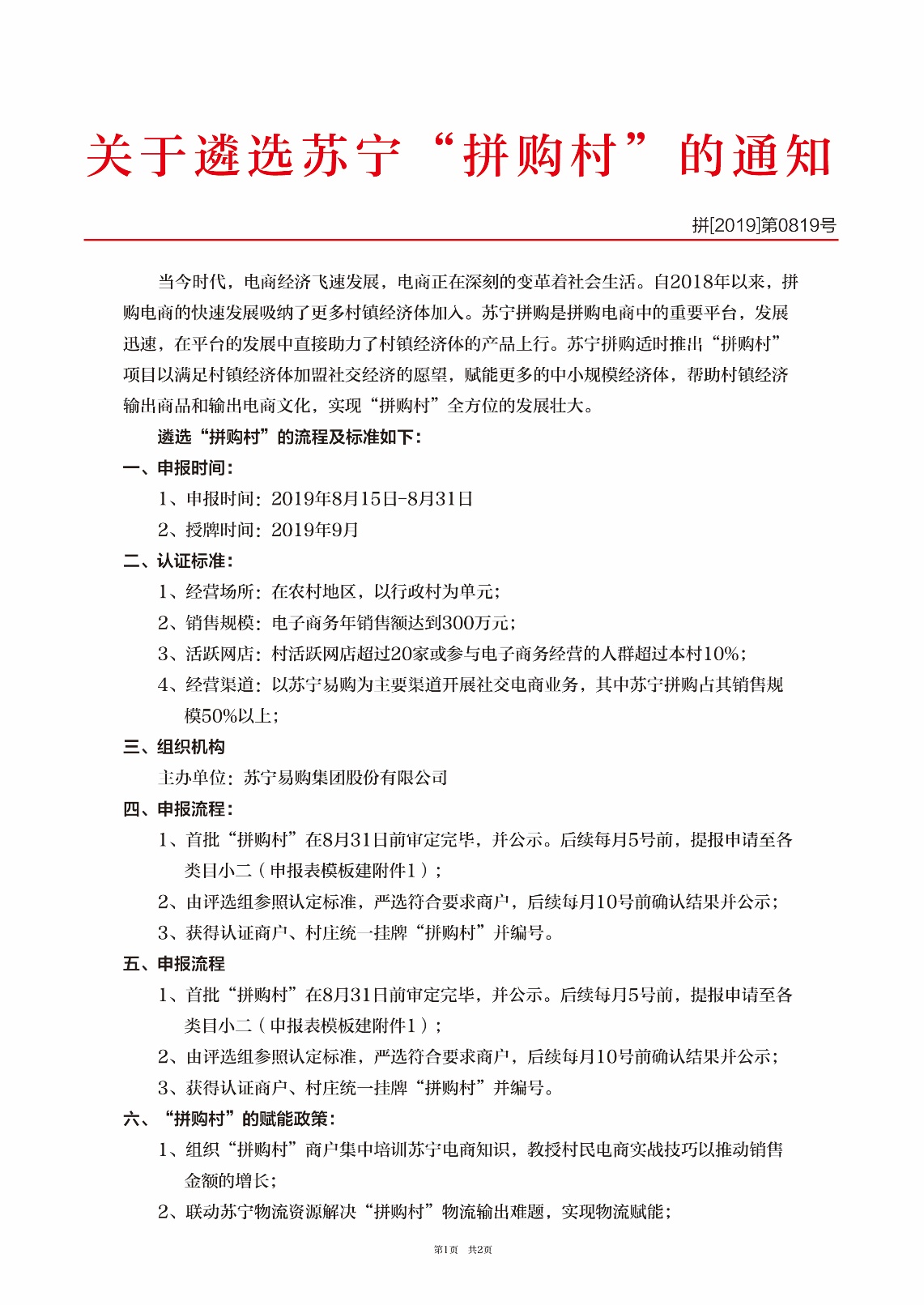 速途網8月30日消息(報道:李楠)近日,蘇寧拼購公布了“拼購村”遴選通知。速途網獲悉,在通知下發(fā)一周多的時間內,“拼購村”評選申請相當火爆,首輪篩選工作同步展開。