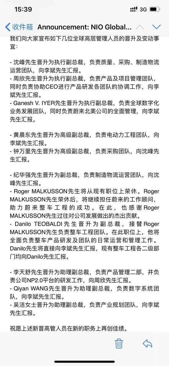 速途網(wǎng)10月12日消息 昨日,一份蔚來全球高層管理人員晉升及變動(dòng)事宜信件在網(wǎng)絡(luò)流傳,信中提及沈峰、周欣、Ganesh V.IYER晉升為執(zhí)行副總裁,向蔚來汽車創(chuàng)始人、董事長(zhǎng)、CEO李斌直接匯報(bào)。黃晨東晉升為高級(jí)副總裁,同時(shí)也向李斌匯報(bào)。鐘萬里晉升高級(jí)副總裁,向沈峰匯報(bào)。