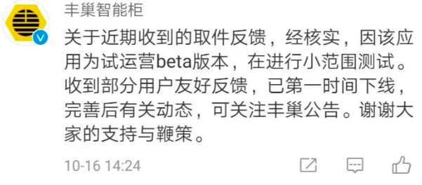 同時,根據(jù)相關(guān)媒體實驗,不僅是自拍照片,偷拍照片也同樣具有此功能。對于這一現(xiàn)象,中國青年報在報道中發(fā)布的截圖顯示,豐巢智能柜官方微博表示,關(guān)于近期收到的取件反饋,經(jīng)核實,因該應用為試運營beta版本,在進行小范圍測試。收到部分用戶友好反饋,已第一時間下線,完善后有關(guān)動態(tài),可關(guān)注豐巢公告。謝謝大家的支持與鞭策。