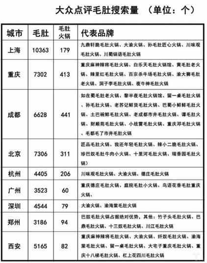 上海顧客對“毛肚”的認知,也積累到了非常高的高度。通過在大眾點評上搜索可以發現,上海銷售“毛肚”的商家超過了毛肚的原產地重慶,排名全國第一。