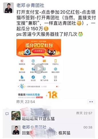 速途網訊 昨日,青團社CEO鄧建波發布朋友圈稱:參與支付寶雙11簽到領喵幣紅包活動后,服務器多次宕機。青團社CEO鄧建波稱,“知道雙11厲害,但還是沒想到雙11帶來的量一下子能這么大,自己的服務器一下子跟不上了,是甜蜜的煩惱。”